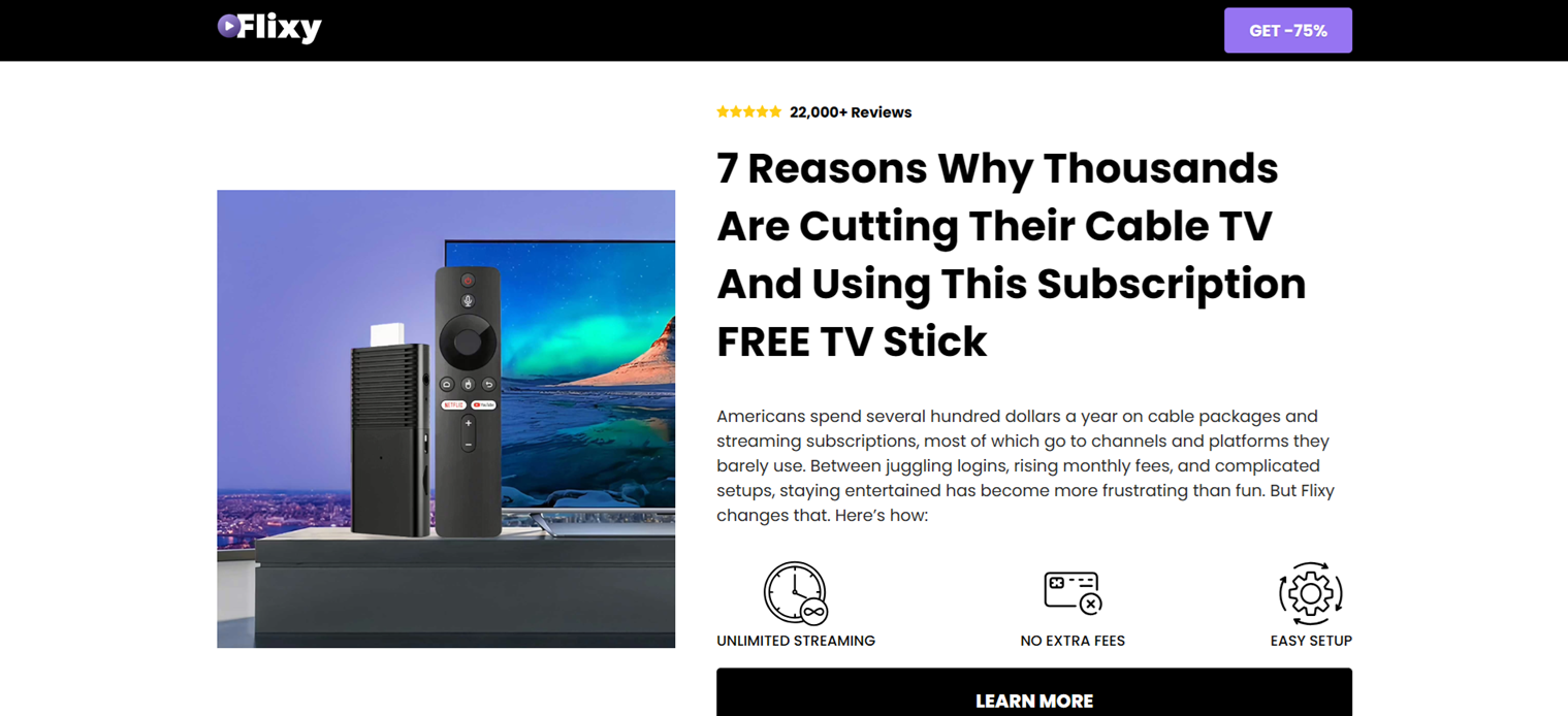 Works with most HDMI TVs Compact & portable design Access to a wide range of streaming apps Secure online ordering Affordable Streaming Device Flixy offers a cost-effective way to enhance your TV setup without complicated installations. Limited-Time Discount Available Flixy is currently available at a discounted price through the official website. Availability may be limited. Verified Buyer “Very easy to set up and use. Exactly what I needed.” Verified Buyer “Smooth performance and simple design.”