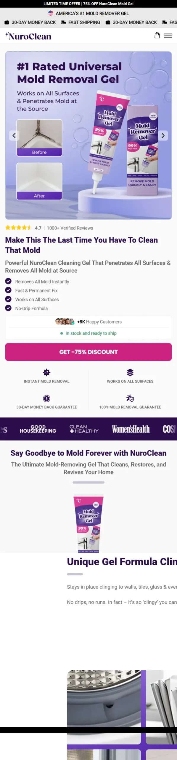 NuroClean features a thick, no-drip gel formula created to help remove visible mold and stains from various surfaces including tile, grout, wood, and more.
