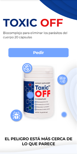 Fortalece la motilidad intestinal y estimula la salida de bilis, lo que ayuda a eliminar los parásitos inmovilizados, así como sus larvas y huevos de toda la cavidad intestinal. Síntoma de una infección parasitaria: Fiebre sin otros síntomas de resfriado o gripe Acción de Toxic Off: Paraliza los parásitos. Esto los inmoviliza y evita que se adhieran a los órganos o a las paredes intestinales. Síntomas de una infección parasitaria: Calambres abdominales, diarrea, picor en el ano o en los genitales, sangre en la orina Acción de Toxic Off: Fortalece la motilidad intestinal y estimula la salida de bilis, lo que ayuda a eliminar los parásitos inmovilizados, así como sus larvas y huevos de toda la cavidad intestinal Síntomas de una infección parasitaria: Enfermedades de la piel, bultos cutâneos Acción de Toxic Off: Cura tejidos y heridas dañados por los parásitos. Restaura la microflora intestinal y mejora la inmunidad Síntomas de una infección parasitaria: Empeoramiento agudo de la visión, dolor muscular Acción de Toxic Off: Crea un ambiente alcalino saludable en los intestinos en el que los helmintos no pueden vivir ni reproducirse. Esto protege de la reinfección Toxic Off tu solución a una infección parasitaria Para crear la fórmula de Toxic Off, los científicos estudiaron cientos de ingredientes con poderosas propiedades antiparasitarias. Las sustancias seleccionadas son únicas. A diferencia de sus análogos, los componentes de Toxic Off no permiten que los parásitos se adapten y sobrevivan: Extracto de ajenjo, cúrcuma Alivian y eliminan los síntomas desagradables que acompañan a la invasión parasitaria: espasmos en el tracto gastrointestinal, náuseas, diarrea y dolor de cabeza. Extracto de Gotu kola, extracto de Amla Estos extractos suprimen el sistema reproductivo de los parásitos y su capacidad para reproducirse. También reducen la capacidad de los parásitos para adherirse a tejidos y órganos, lo que acelera su excreción del cuerpo junto con los huevos. Extracto de apio
